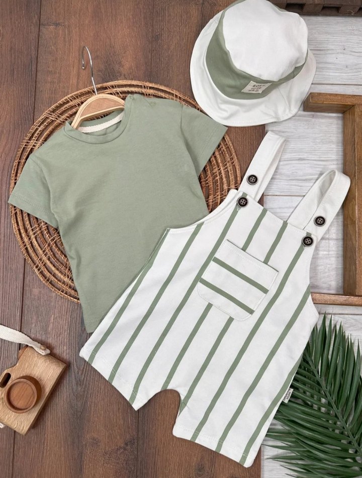 Erkek bebek için kısa kollu, bisiklet yaka pamuklu khaki tişört ve ön cepli çizgili tulum seti. Rahat ve şık sokak stilinde tasarlanmıştır.