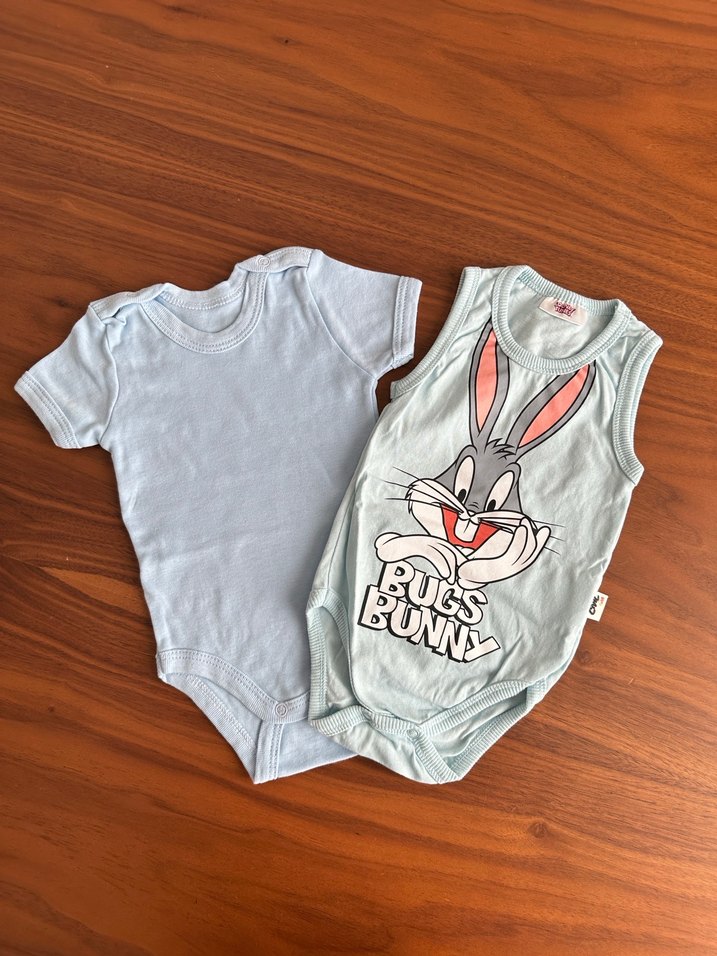 Yumuşak pamuktan yapılmış, kolsuz, yuvarlak yakalı ve pastel gri renkte, Bugs Bunny baskılı rahat sokak stili bebek bodysi.