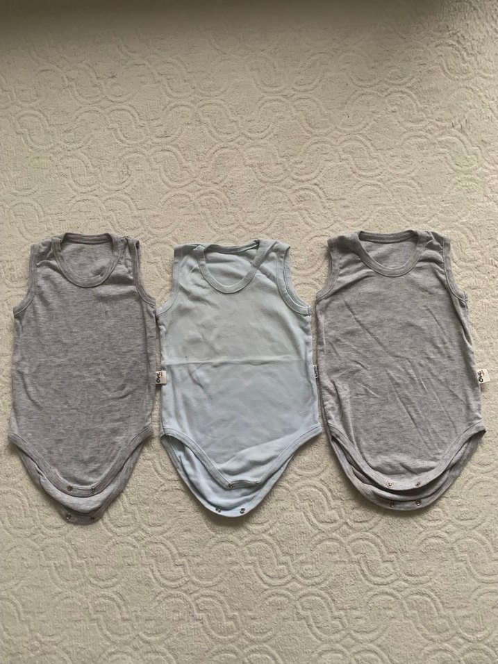 Yumuşak keten kumaştan, kolsuz, gri - mavi renkte ve yuvarlak yakalı erkek bebek bodysuitleri.