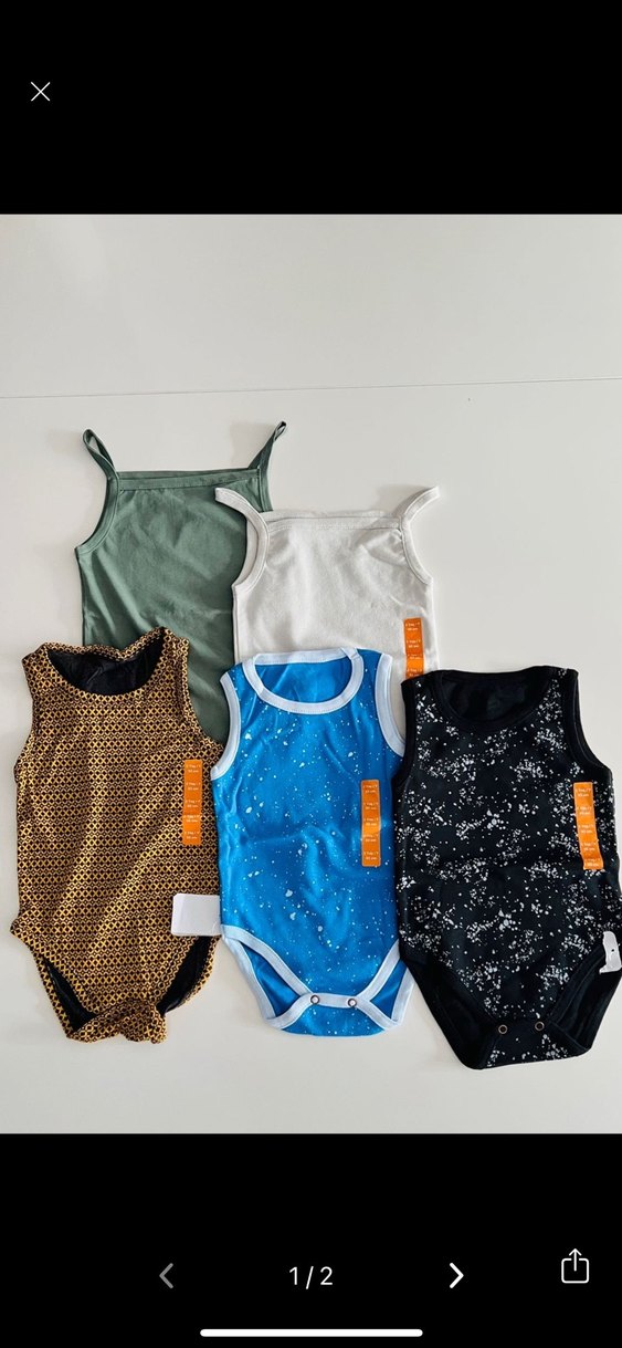 Farklı renk ve desenlerde, kolsuz ve askılı yaka tasarımlı erkek bebek bodyleri, yumuşak sentetik kumaştan, rahat kullanım için uygun.