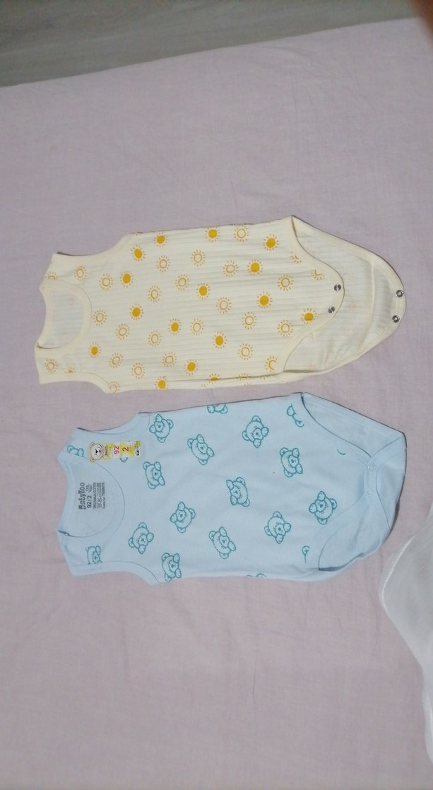 Pastel renklerde, kolsuz ve çıtçıtlı erkek bebek body seti. Birinde güneş, diğerinde ayıcık deseni bulunur. Yumuşak ve rahat kumaş.Tanesi 100 tl. İki adet 200 tl.