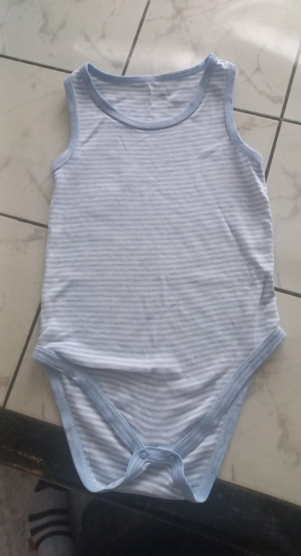 Kolsuz, yuvarlak yaka erkek bebek body, yumuşak sentetik kumaştan üretilmiş. Gri ince çizgili ve alt kısmında çıtçıtlı kapanış bulunur.