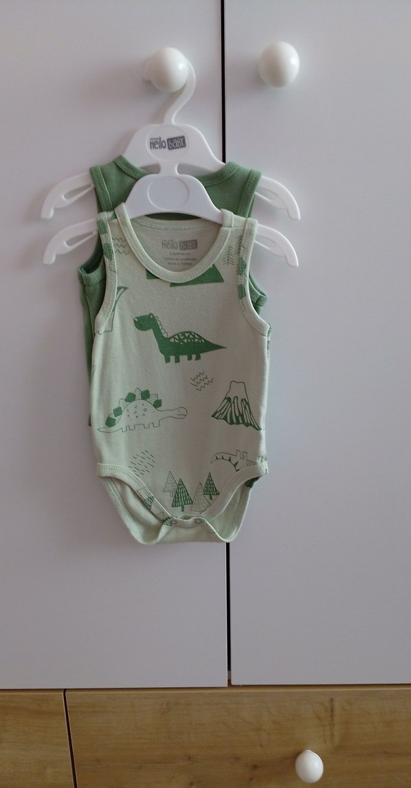 Pastel yeşil renkte, dinozor desenli kolsuz erkek bebek body. Yumuşak kumaştan, kolay giyimi sağlayan çıtçıtlı tasarım.hic kullanılmadı yepyeni 2li fiyatı