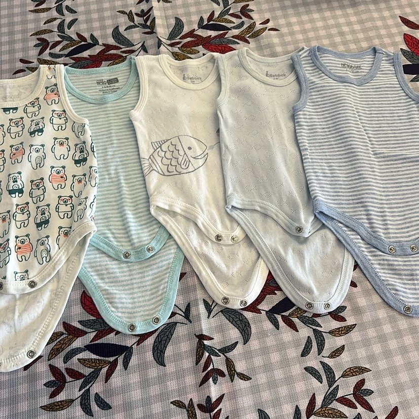 Kolsuz, nakışlı desenli, askısız yakalı beyaz ve gri tonlarda yumuşak dokulu bebek bodysi. 5 li fiyatıdır