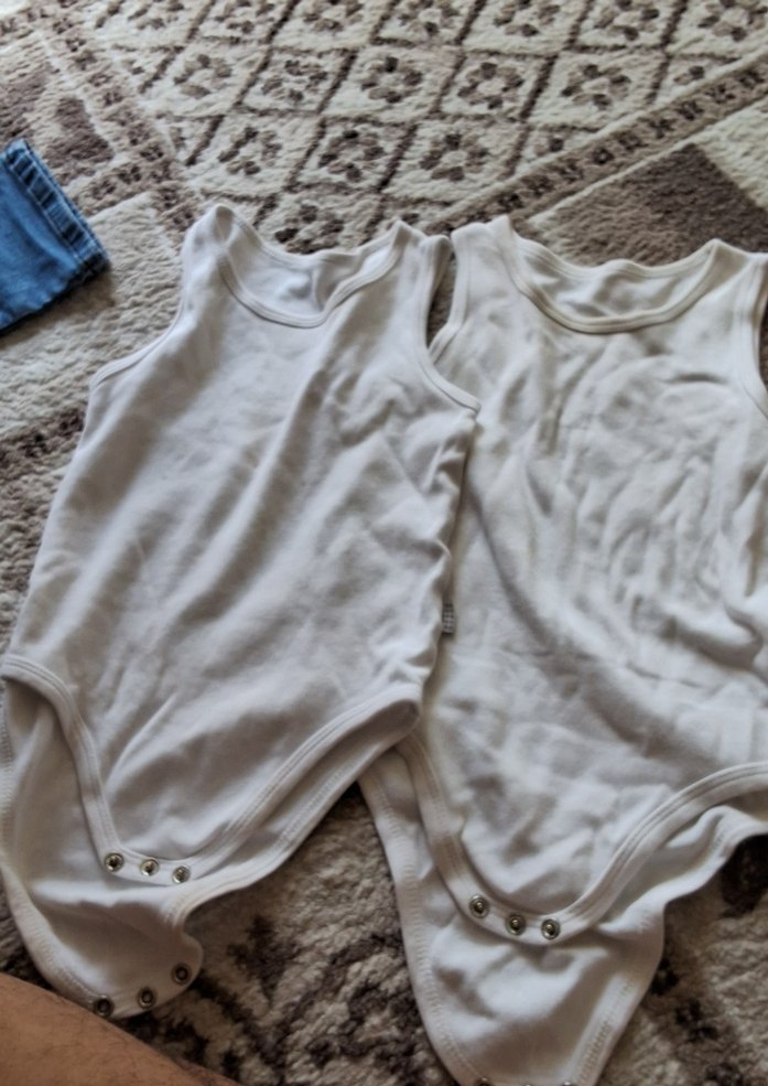 Kolsuz, yuvarlak yakalı, beyaz pamuklu erkek bebek body. Rahat ve sade tasarımıyla günlük kullanıma uygundur. 2 adet 1i lekesi var hafif