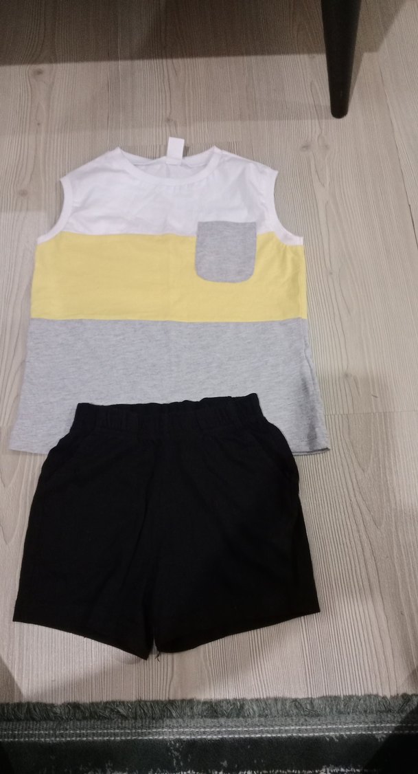 Erkek bebekler için kolsuz pamuklu takım. Üstü renk bloklu, küçük cep detaylı, bisiklet yaka. Siyah şortla tamamlanmıştır. Rahat ve günlük stil.
