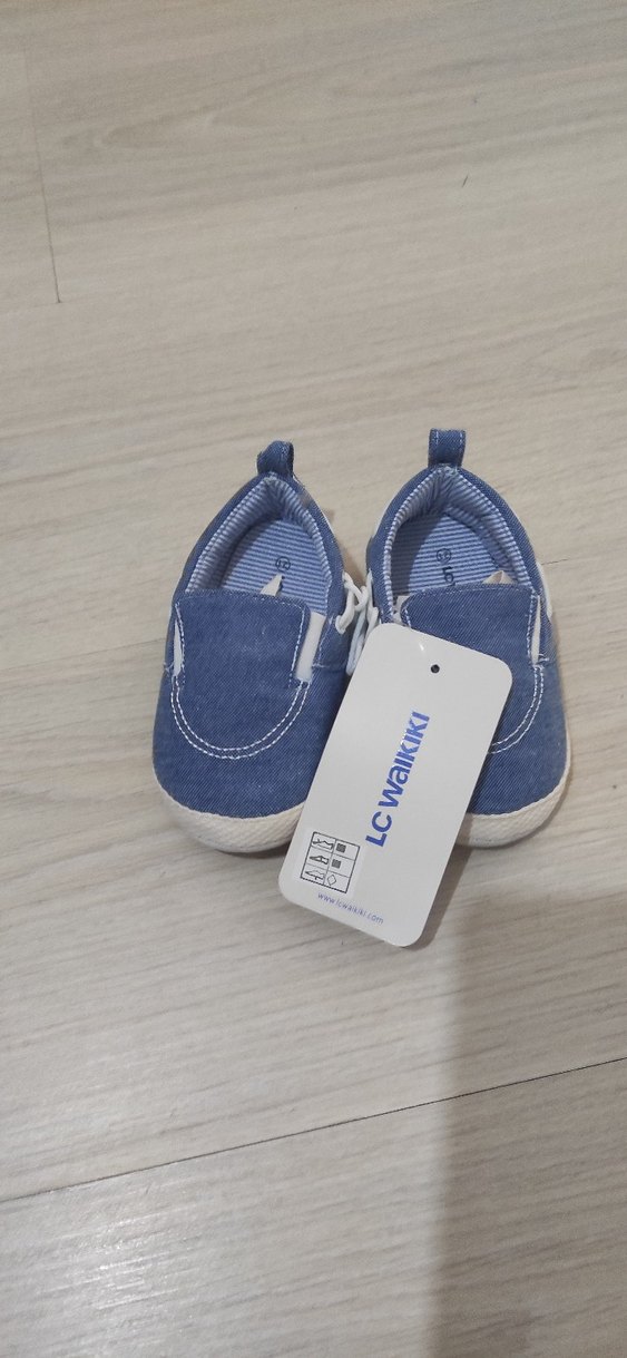 Mavi kot görünümlü kumaştan erkek bebek ilk adım ayakkabısı, kolay kullanım için kenarlardan lastikli yapıya sahiptir. Sade tarzıyla günlük kullanıma uygundur.