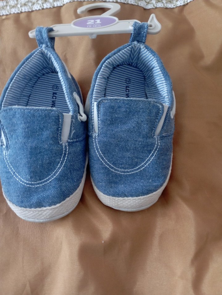 Erkek bebekler için mavi kot kumaştan, velcro kapamalı, sade tasarımlı ilk adım ayakkabısı. Trendy ve rahat bir stil sunar.