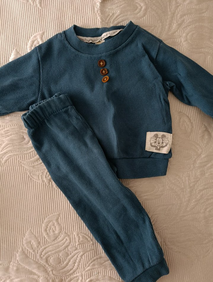 Koyu mavi renkli, uzun kollu ve yuvarlak yakalı erkek bebek takımı. Yumuşak kot kumaştan üretilmiş olup düğmeli detaylara sahiptir. Desensiz sade tasarım.