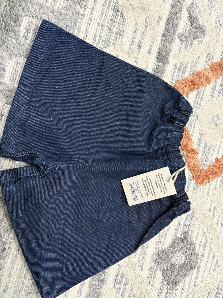 Koyu mavi kot şort, bol kesim ve fırfır detaylı. Erkek çocuk için kot şort sıfır üründür etiketli hiç kullanılmadı