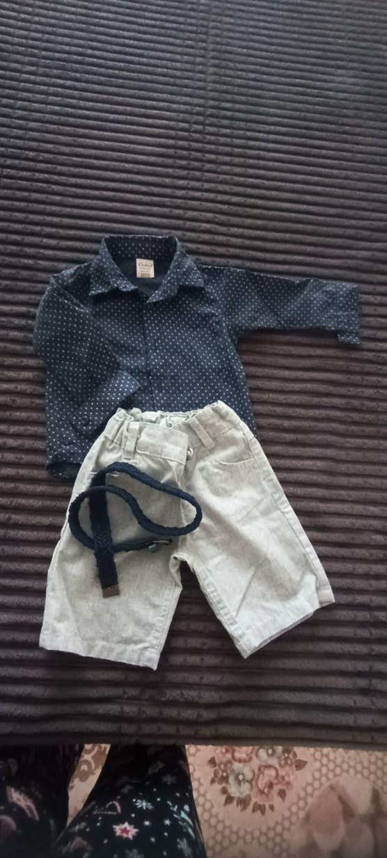 Erkek bebek için gri kot pantolon kemerli, koyu renk uzun kollu ve yakalı gömlekten oluşan sokak tarzı takım. Hiç bir sorunu yoktur.