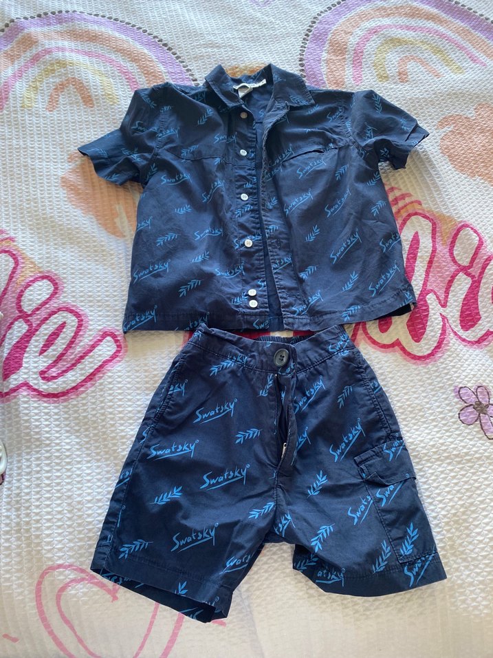 Koyu mavi kot kumaştan, kısa kollu ve düğmeli yakalı gömlek ile batik desenli şorttan oluşan erkek bebek ikili takımı. İstenirse parça parçada verilebilit