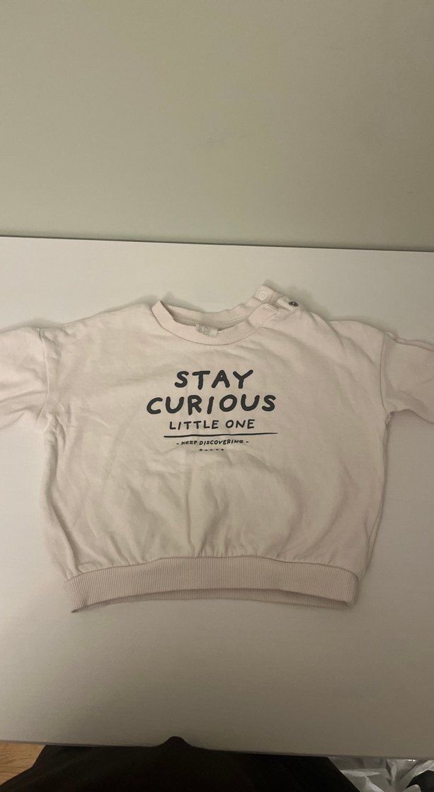 Pamuklu, uzun kollu, bol kesim gri sweatshirt. "STAY CURIOUS LITTLE ONE" baskılı, rahat ve şık sokak stili için uygun.