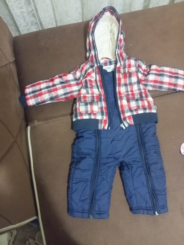 Lacivert fermuarlı, yumuşak kumaş astarlı erkek bebek kayak tulumu. Kapüşonlu ve kırmızı kareli ceketli, sokak stiline uygun.