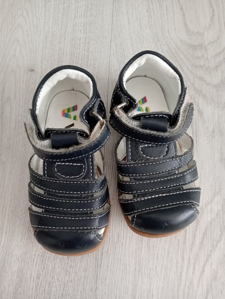 Lacivert renkte, kauçuk tabanlı, tokalı erkek bebek ilk adım ayakkabısı, rahat sokak stili için uygun.