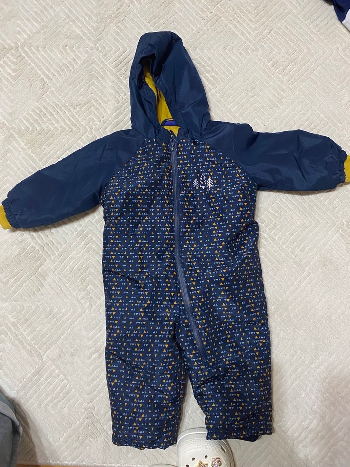 Lacivert kapüşonlu bebek tulumu, fermuarlı ve yumuşak, sıcak kumaş kullanılarak üretilmiştir. Sokak stiline uygun desenlidir. ❄️