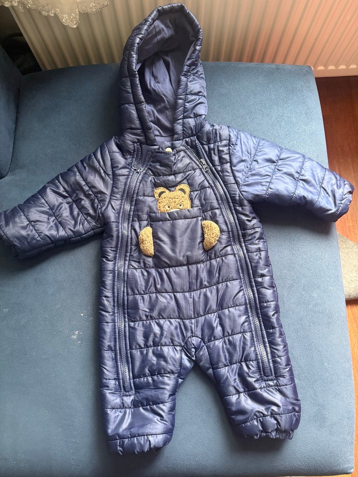 Lacivert kapüşonlu bebek tulumu, ön fermuarlarıyla kolay giyilir. Yumuşak ve sıcak kumaştan, göğüste ayıcık detaylı.