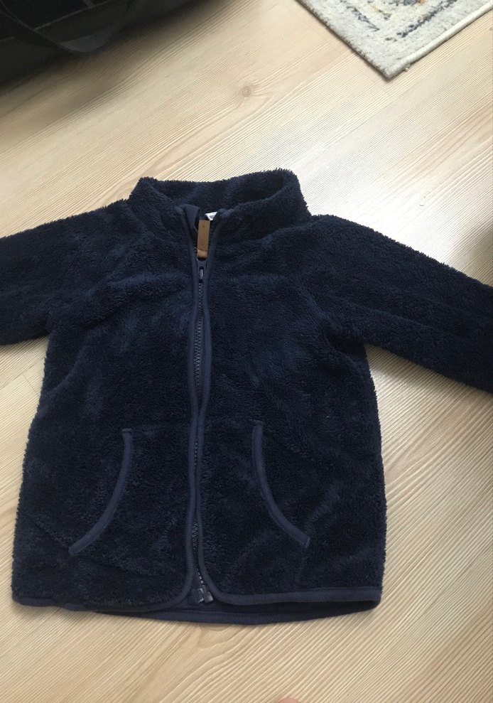 Erkek bebek için lacivert, kürklü detaylı, yumuşak polar kumaştan, dik yakalı, fermuarlı ve cepli sade ceket.