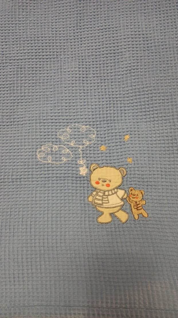 Pamuk kumaştan yapılmış, mavi renkte, nakışlı ayıcık ve yıldız desenli çocuk uyku örtüsü. Ürün tertemiz ve sorunsuzdur, yeni gibidir. Ölçüsü 80x110 cm .