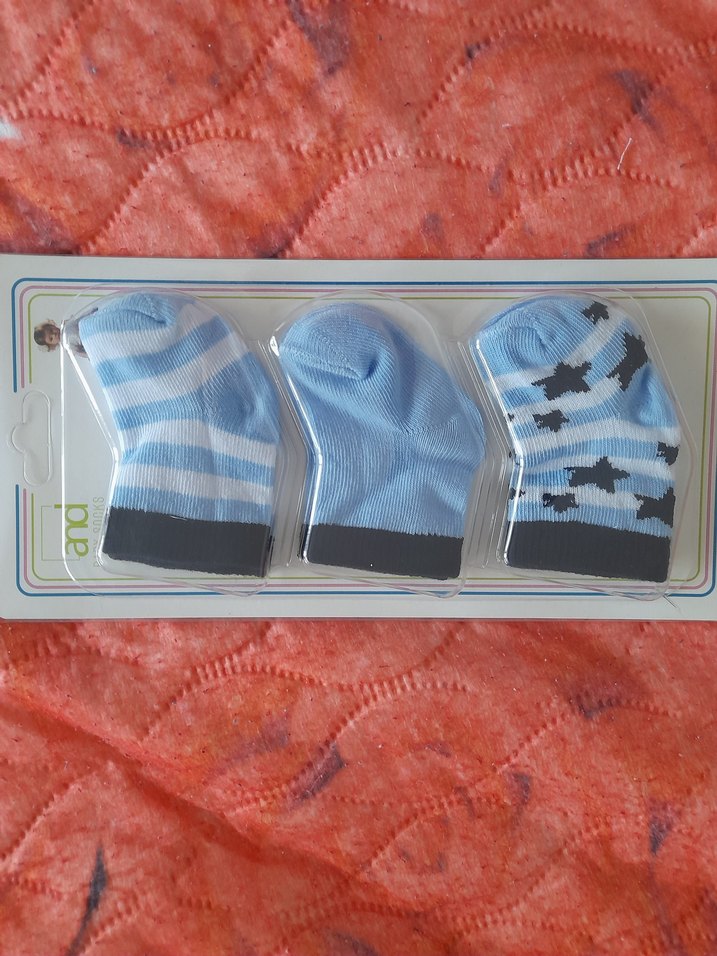 Üçlü erkek bebek çorap seti, mavi tonlarda, çizgili, düz ve yıldız desenli. Yumuşak ve rahat kumaş.