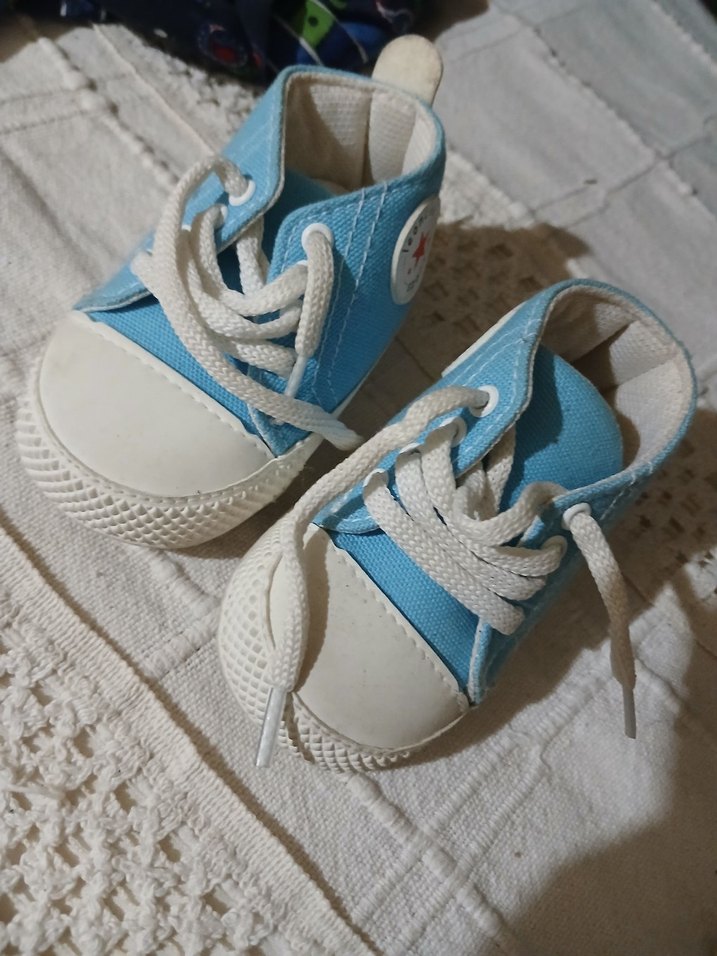 Erkek bebekler için pastel mavi, kauçuk tabanlı, elastik detaylı, desen içermeyen ilk adım ayakkabısı. Trendy sokak stili için uygun. son fotoğrafta defosunun resmi var arka çizgi çubuğunun üst kısmında yırtılma oldu diğerini de kesip isteyen aynı boy yapabilir