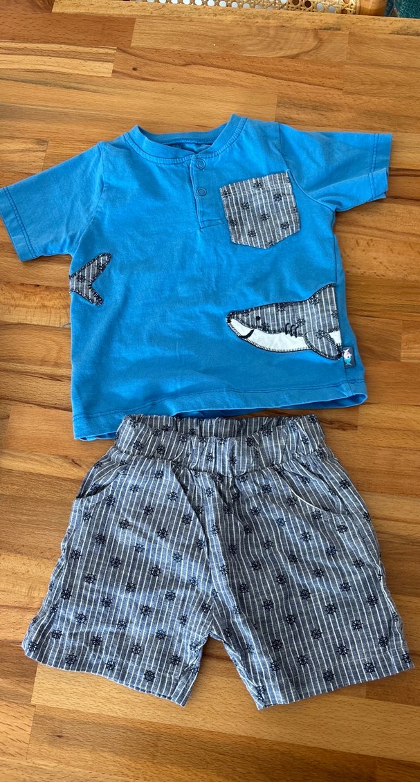Mavi kısa kollu düğmeli tişört ve gri çizgili elastik bel şortlu bebek takımı.