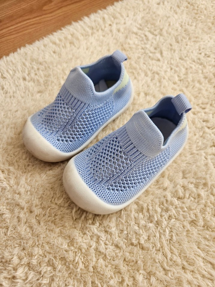 Pastel mavi örgü yüzeyli, kauçuk tabanlı erkek bebek ilk adım ayakkabısı. Rahat ve destekleyici, sade ve gündelik tasarım. yurt dışı ürünü