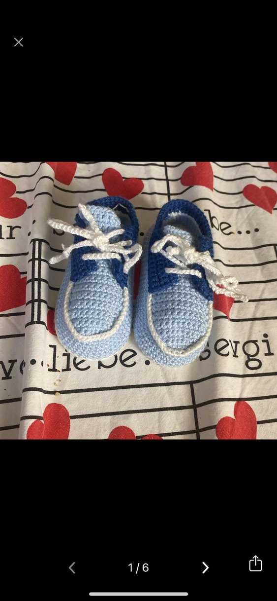 Mavi renkli, örgü bebek patik, beyaz bağcıklarla sade ve renkli bir görünüme sahiptir. AyAK NUMARASINI TEMSİLİ Yazdım 12 cm