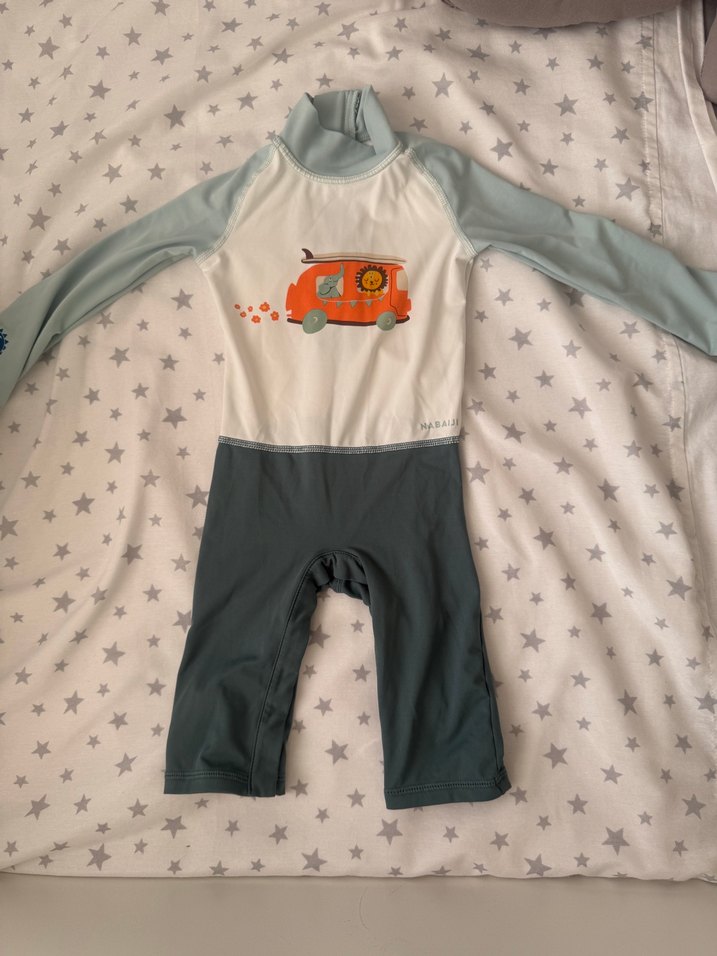 Bir defa giyildi bedeni 18 aylık ancak esnek bir kumaşı var 50 UPF güneş korumalı piyasanın çok altında veriyorum