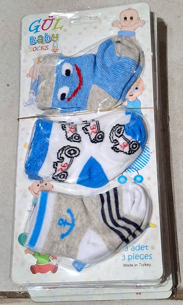 Mavi, gri ve beyaz tonlarında, nakışlı desenlere sahip üç çift erkek bebek çorabı seti. Türkiye yapımı.