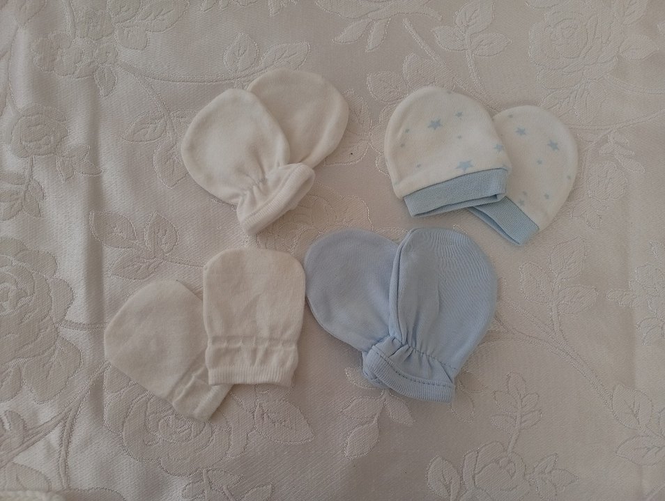 Pastel beyaz ve mavi tonlarda nakışlı, yumuşak ve sıcak erkek bebek eldivenleri. Cilde nazik ve rahat. ❄️
