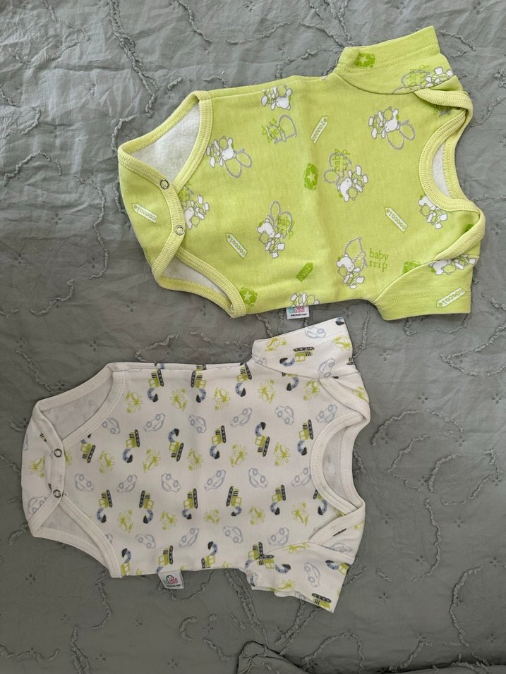 Yumuşak pamuklu, kısa kollu örgü dokulu erkek bebek body. Pastel yeşil ve beyaz renklerde, eğlenceli desenlerle, sokak stiline uygun.