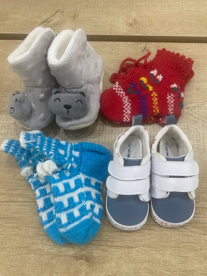 Erkek bebekler için renkli, örgü malzemeden yapılmış, nakış desenli ilk adım ayakkabısı. Rahat ve şık tasarım.4 adet fiyatıdır