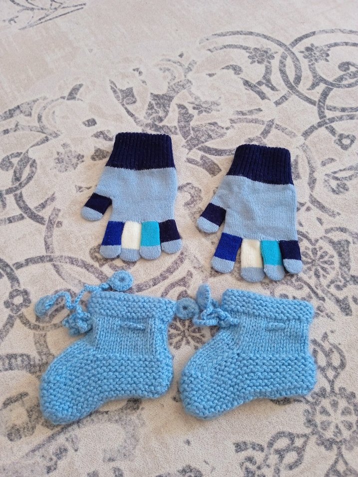 Erkek bebekler için yumuşak örgü mavi patik ve renkli parmaklı eldivenler. Rahat ve sade tasarım, günlük kullanıma uygun. eldiven hediye