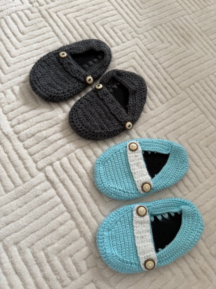 Gri renkte, düğmeli bant detaylı, örgü erkek bebek patikleri. Yumuşak örgü kumaştan üretilmiştir.