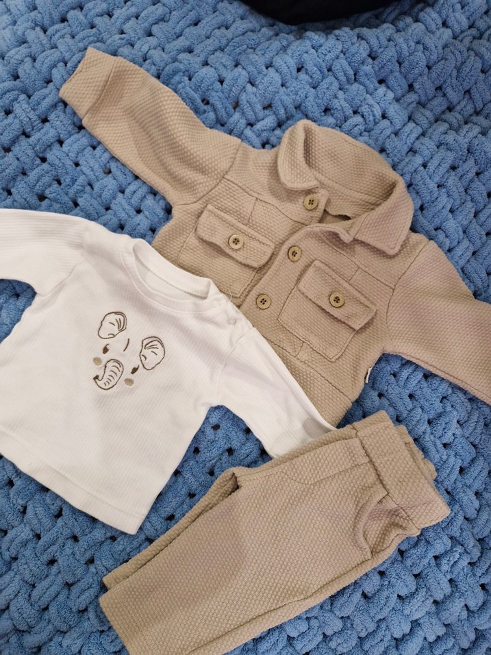 Pastel kahverengi örgü uzun kollu ceket, yakalı pantolon ve beyaz işlemeli uzun kollu tişörtten oluşan erkek bebek 3'lü set. 6-9 ay icin uygun . Bir kez giyildi