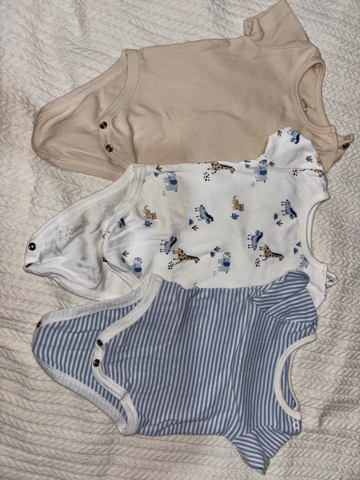 Lcw ürünüdür. Yumuşak pamuktan yapılmış, düğmeli ve yakalı üç kolsuz bebek body seti. Pastel mavi çizgili, hayvan desenli ve sade bej renk seçenekleri bulunur. 2-3 defa giyildi
