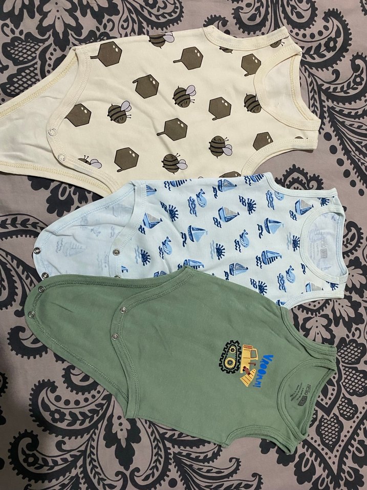 Pamuklu, kolsuz, düğmeli ve bisiklet yaka erkek bebek body seti. Pastel tonlarda arı, yelkenli ve iş makinesi desenleriyle sokak tarzı sunar.