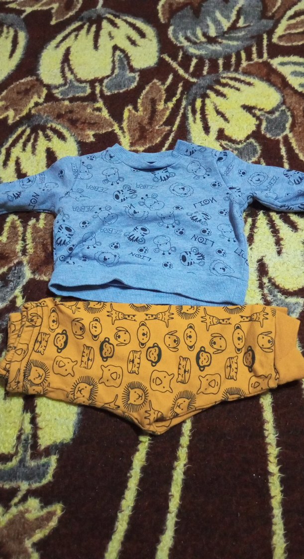 Erkek bebek için uzun kollu, bisiklet yaka ve örgü detaylı yumuşak ve sıcak kumaştan yapılmış renkli bağlama desenli 2 parçalı takım. Üstü mavi, altı kahverengi hayvan desenlidir.