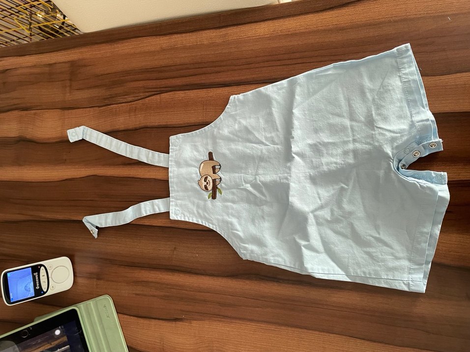 Bej renkte, nakışlı bebek salopet Ayarlanabilir boyun kayışlarına ve pürüzsüz kumaşa sahiptir. 6-9 ay uyumlu