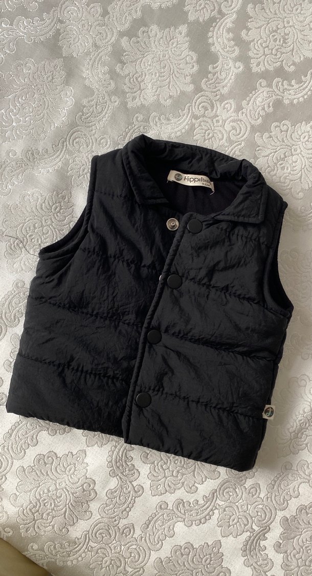 Siyah keten kumaştan yapılmış, düğmeli, kolsuz yelek. Yakalı ve sade, dar kesimli tasarımıyla sokak stiline uygun.