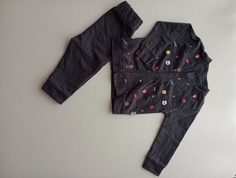 Düğmeli, uzun kollu penye üstü nakışlı desenlerle ve kesik yaka ile, siyah pantolonla kombinlenmiş erkek bebek takımı. Sokak stiline uygun. 6-9 ay.