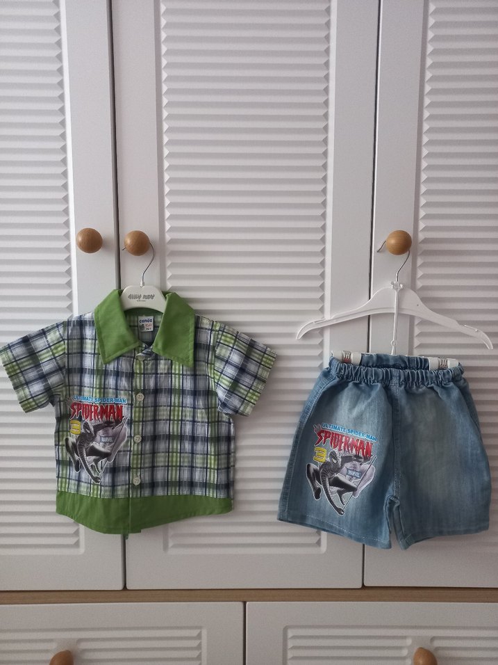 Kısa kollu, düğmeli ekose gömlek ve Spiderman baskılı kot şorttan oluşan erkek bebek takımı. Gömleğin yeşil yakası dikkat çekiyor. ️
