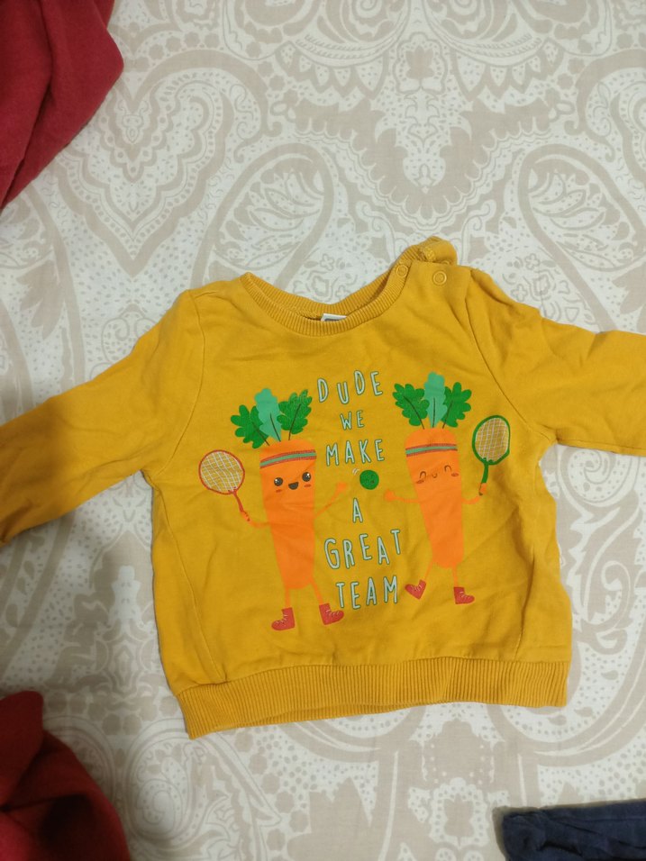 Sarı renkli, uzun kollu, pamuklu erkek çocuk sweatshirtü, bol kesim ve yuvarlak yakaya sahiptir. İki havuç figürünün tenis oynadığı renkli baskı ve 'Dude We Make A Great Team' yazısı bulunur. Triko kumaş rahatlık sağlar. Beyaz olanin önünde hafif leke var yikaninca çıkar