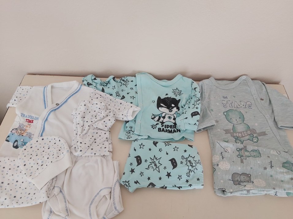 Mavi baskılı uzun kollu pamuklu kumaştan yapılmış erkek bebek takımı. Üstünde kolay giydirme için düğmeler bulunur.