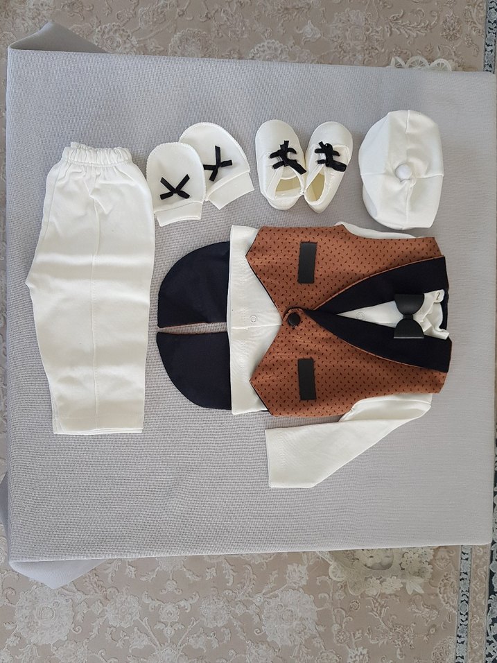 Düğmeli kolsuz yelek Papyonlu Uzun kollu body Beyaz pantolon Ayakkabı Eldiven Şapka içerir. 6 parçadan oluşuyor. 0-6 aylık.