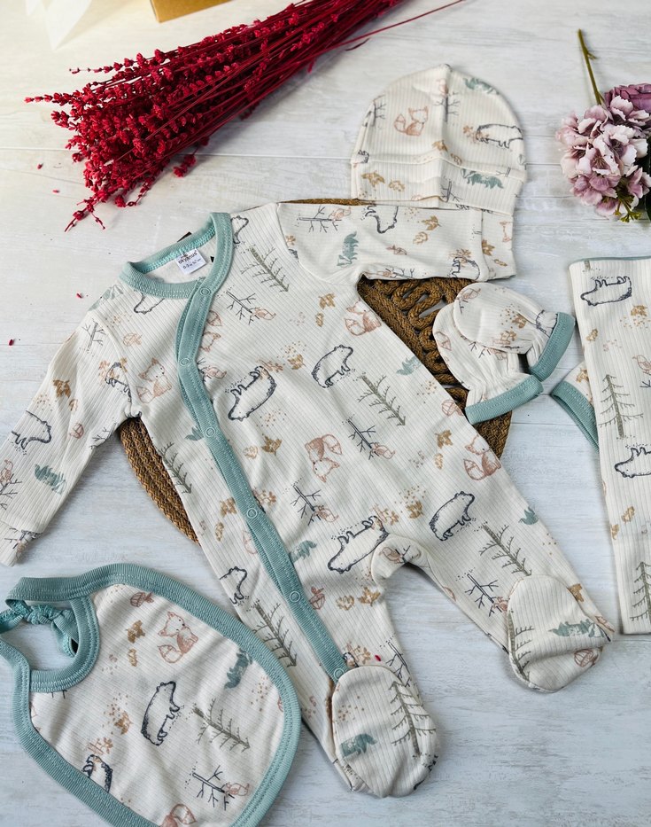Set İçeriği: Kruvaze yakalı, tek taraftan tam boy çıtçıtlı, patikli tulum Şapka Eldiven Önlük Battaniye %100 pamuklu kumaşı sayesinde bebeğinizin cildine nefes aldırır, terletmez ve yumuşacık bir dokunuş sunar. Yeşil tonlarının ağırlıkta olduğu doğal tasarımıyla her mevsim kullanım için uygundur.