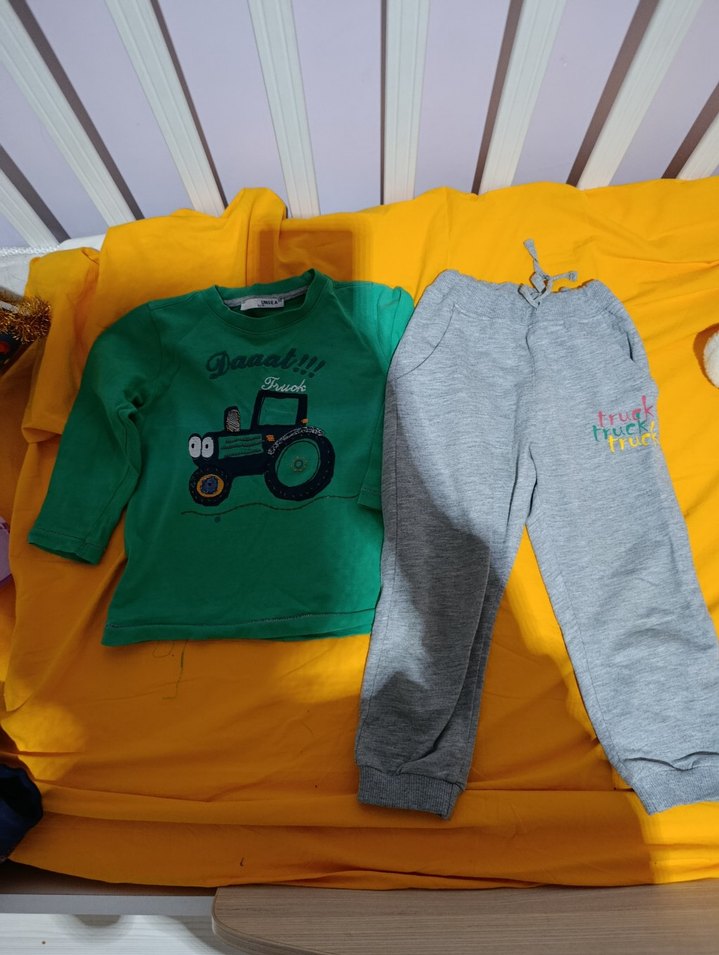 Yeşil traktör baskılı uzun kollu üst ve gri renkli örme pantolondan oluşan erkek bebek takımı. Üstte yuvarlak yakalı rahat kesim, pantolonda ayarlanabilir bel bulunur. sağlam. sadece 3. fotoğrafta görünen lekeleri var. unsea marka. 98 cm