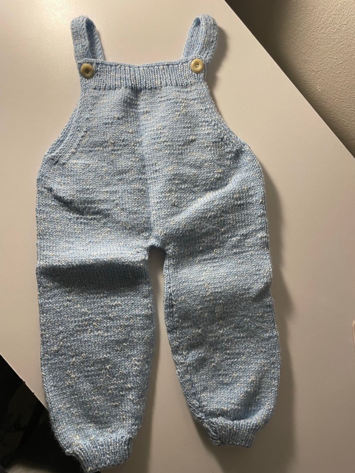 Mavi ve gri tonlarda, yumuşak triko kumaştan örülmüş, düğmeli askılı, kolsuz ve bol kesim erkek bebek tulumu. Rahat ve sade tasarım.