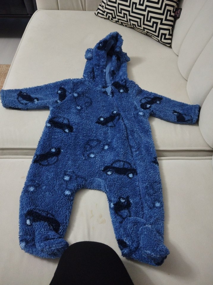 Koyu mavi renkli, araba desenli kapüşonlu ve kulaklı erkek bebek tulumu. Sokak stili için sıcak tutar. ❄️